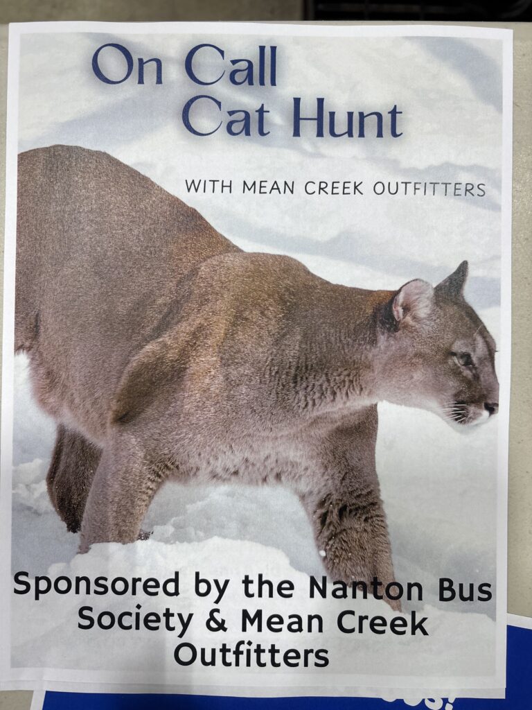 Are you interested in a memorable, local cougar hunt—and in supporting the Nanton School Enhancement Project? A premium On-Call Cat Hunt with Mean Creek Outfitters has been donated for telephone auction Saturday, November 1. These hunts typically book at a high price; this is a rare chance to secure the experience at a potentially reasonable auction price.